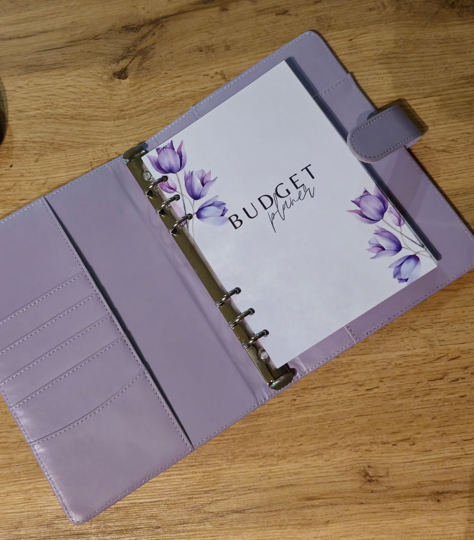 Du kannst den Budget Planer mit einer Spiralbindung oder mit dem passenden Binder in A5 (Der Binder hat einen Magnetverschluss und passende Taschen für Challenges etc.) bestellen.