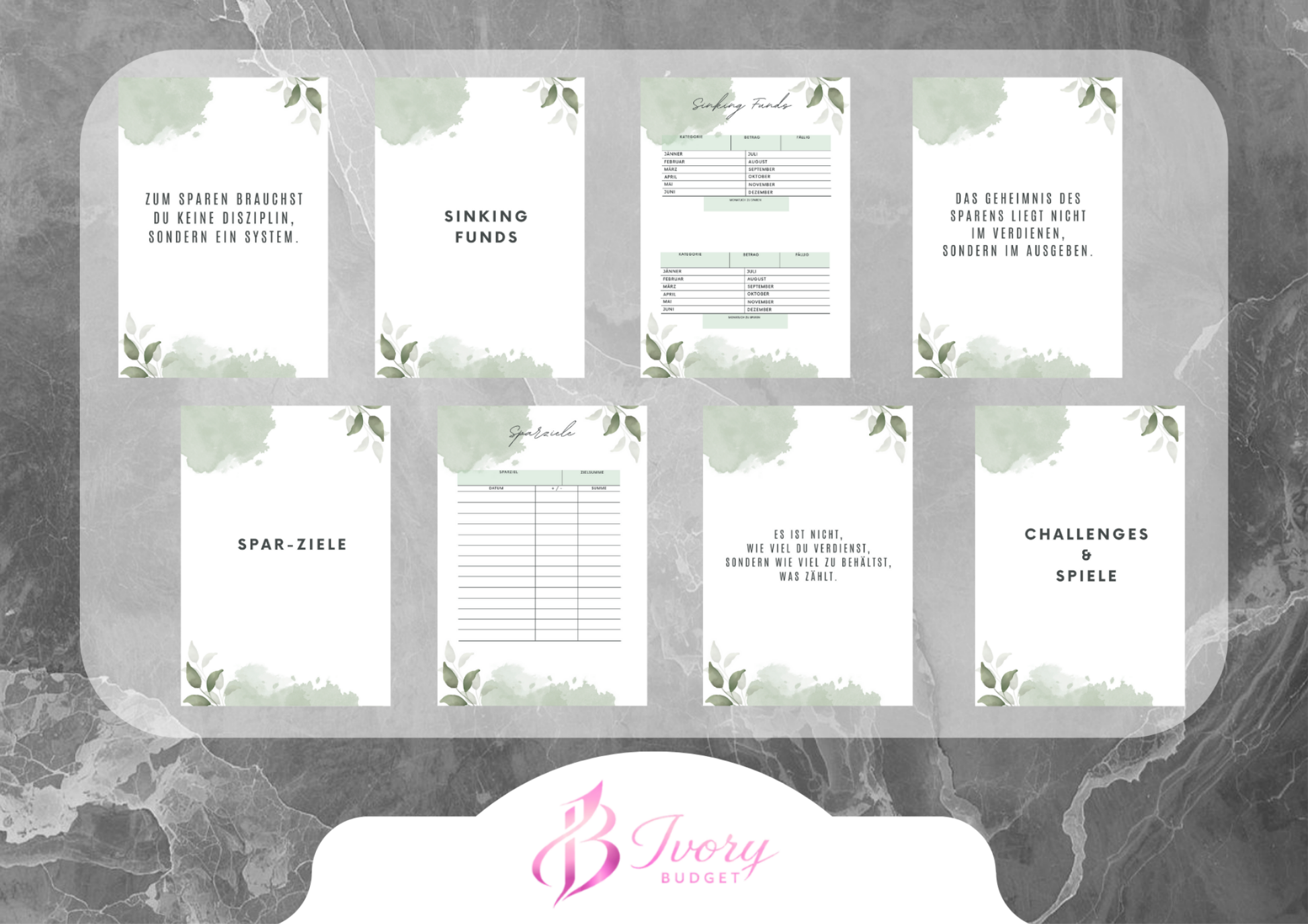 Du erhältst einen Planer mit 12 Monate (undatiert) für dein monatliches Budget zusätzlich hast du hinten deine Sinking Funds, deine Spar-Ziele, deine Challenges & Spiele und eine Jahresübersicht.