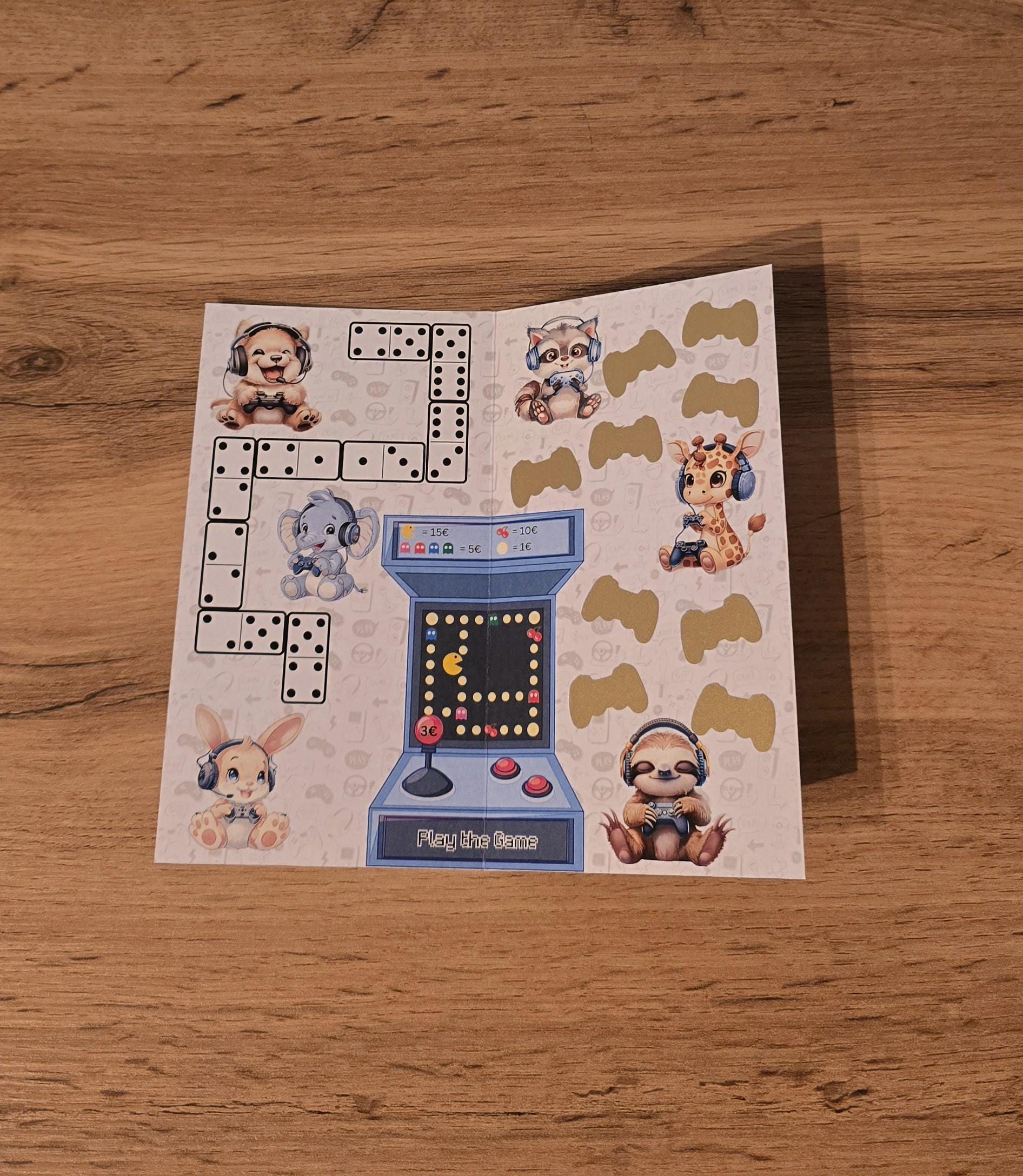 Spare mit der 2-seitigen Klappkarte indem du die Controller frei rubbelst, PacMan spielst oder würfelst für das Domino-Spiel.