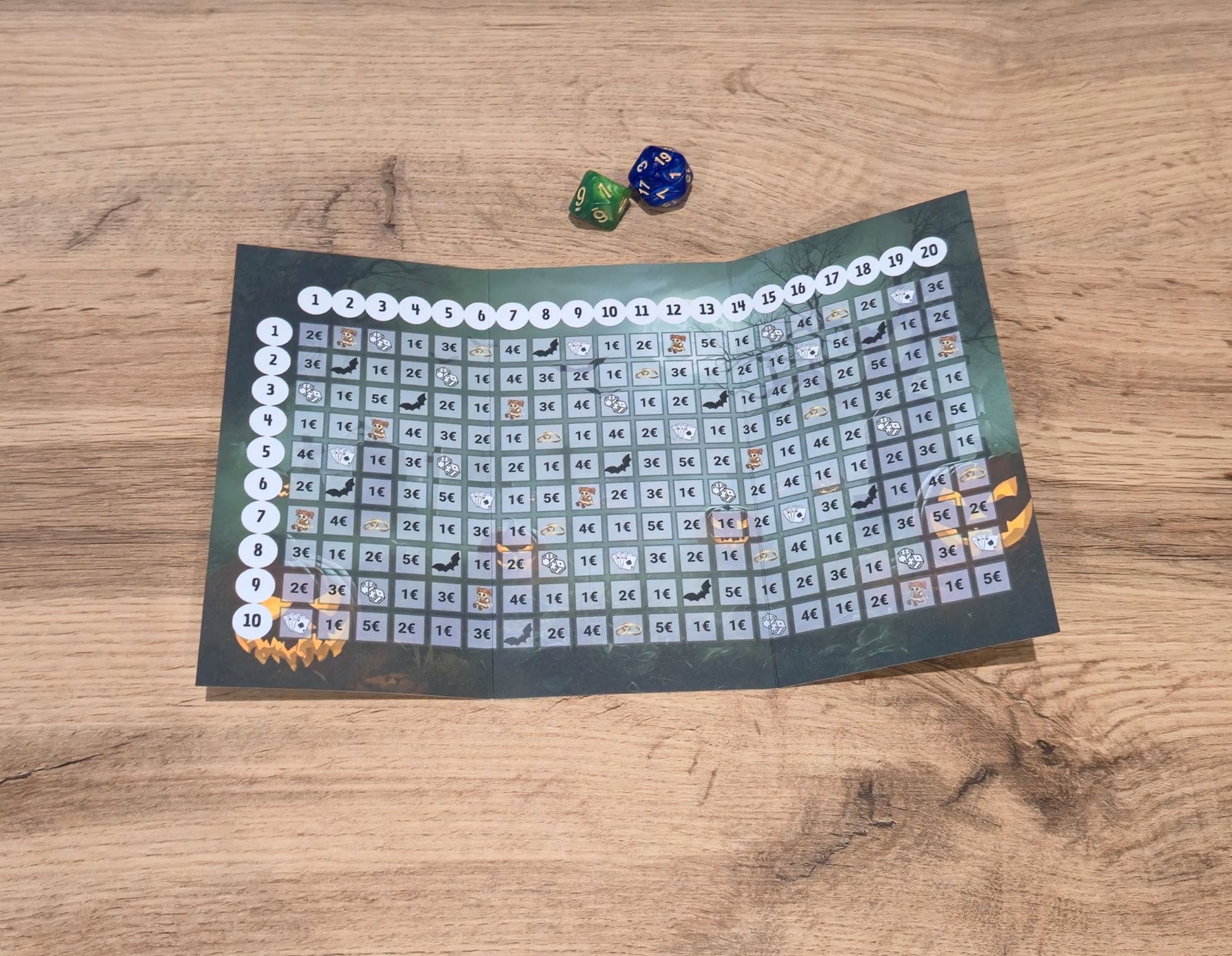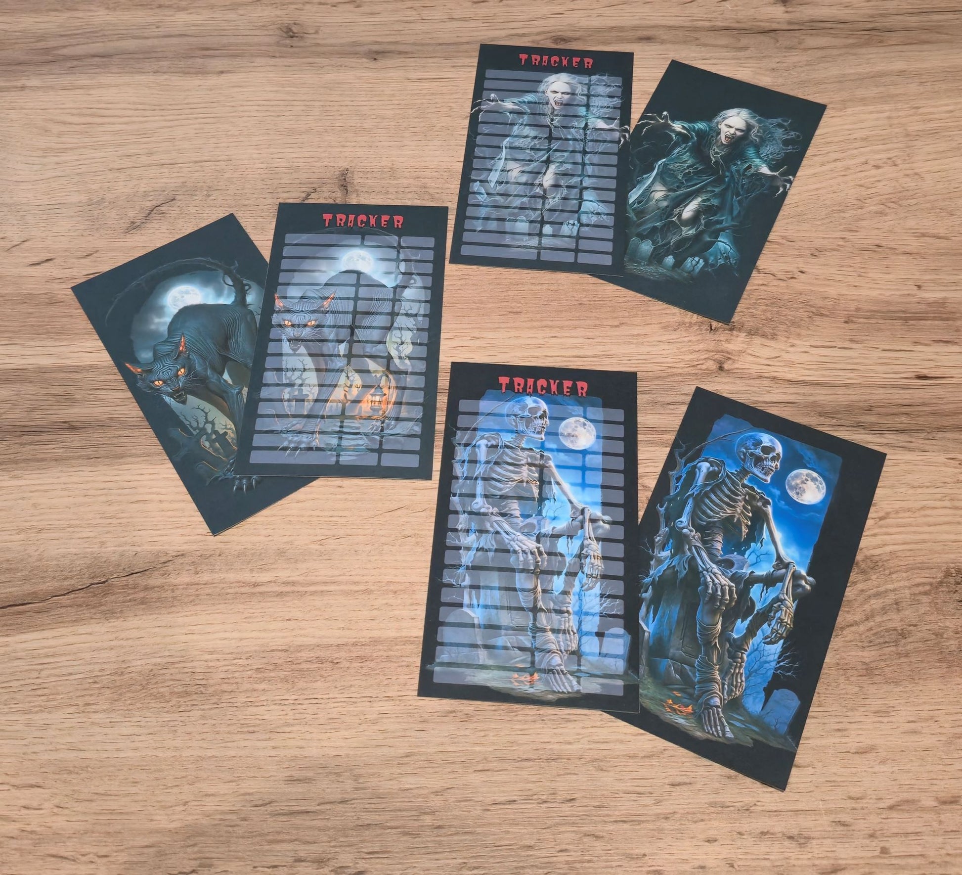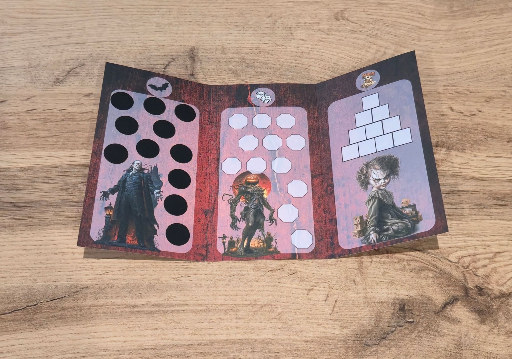 Die Klappkarte ist ein großes Bingo mit einer Zusatzkarte, 6 Tracker im Horror Design und 2 Würfel (10er + 20er) Farbe ist Zufall. Anleitung ist hinten auf der Bingokarte.