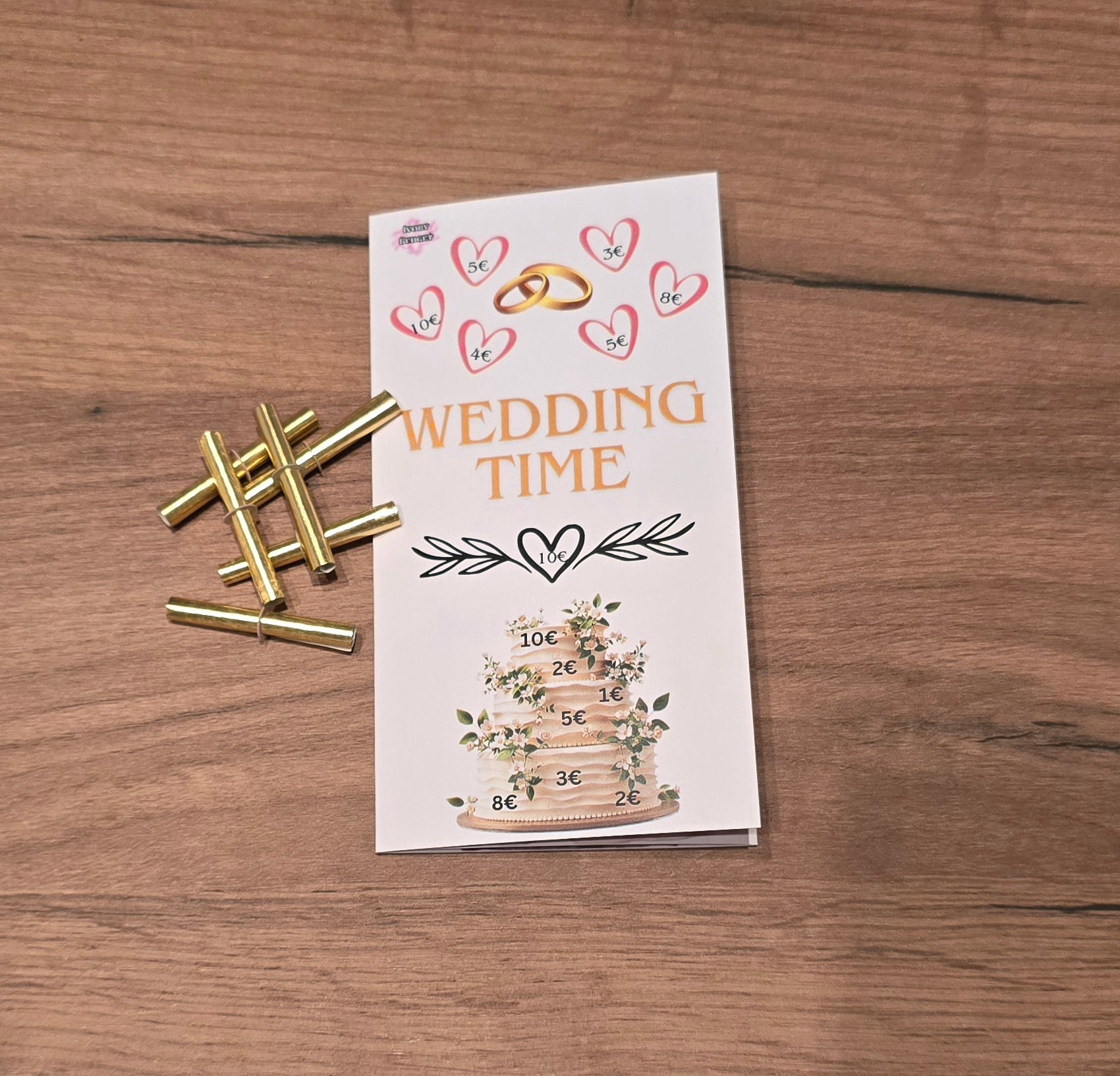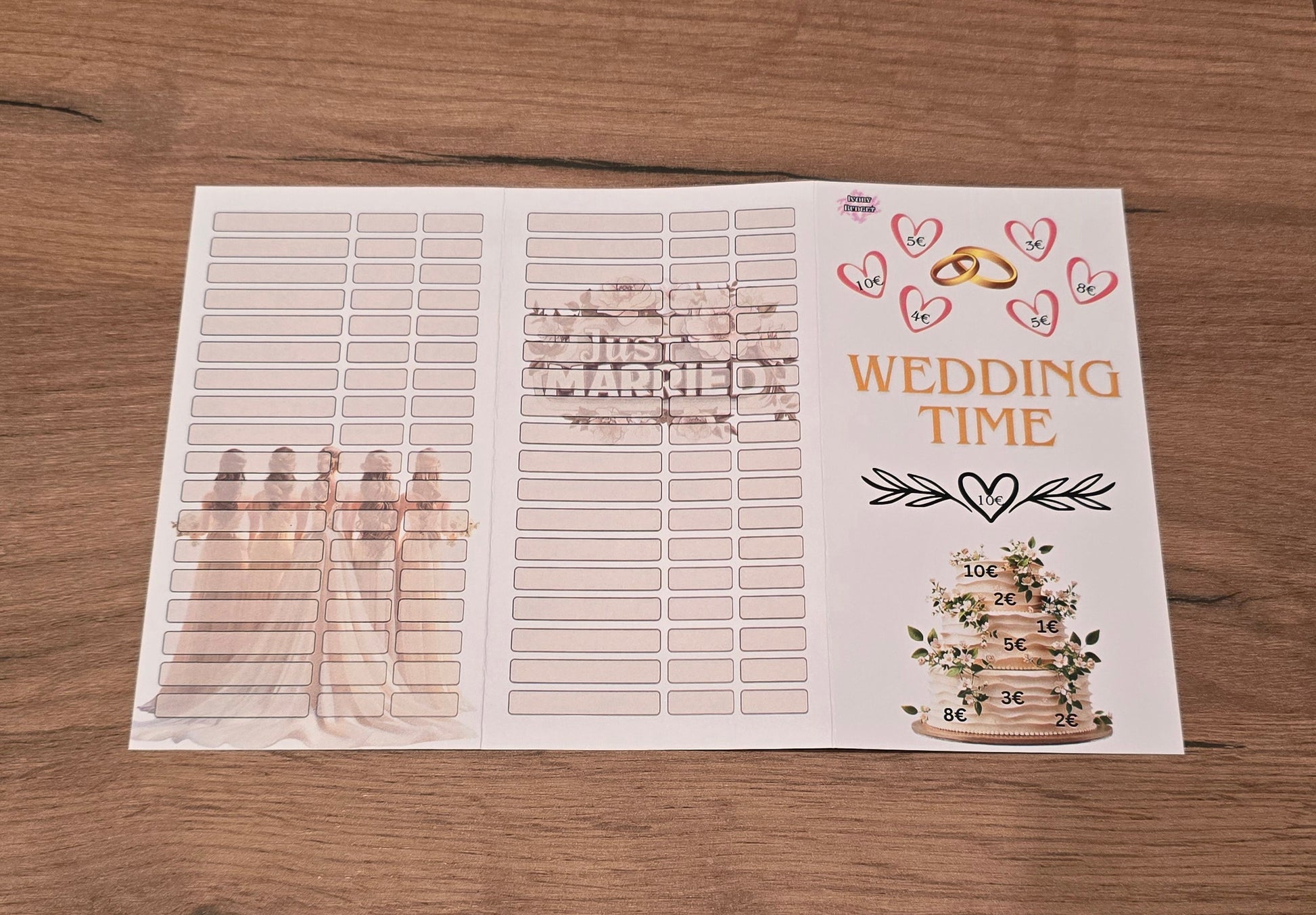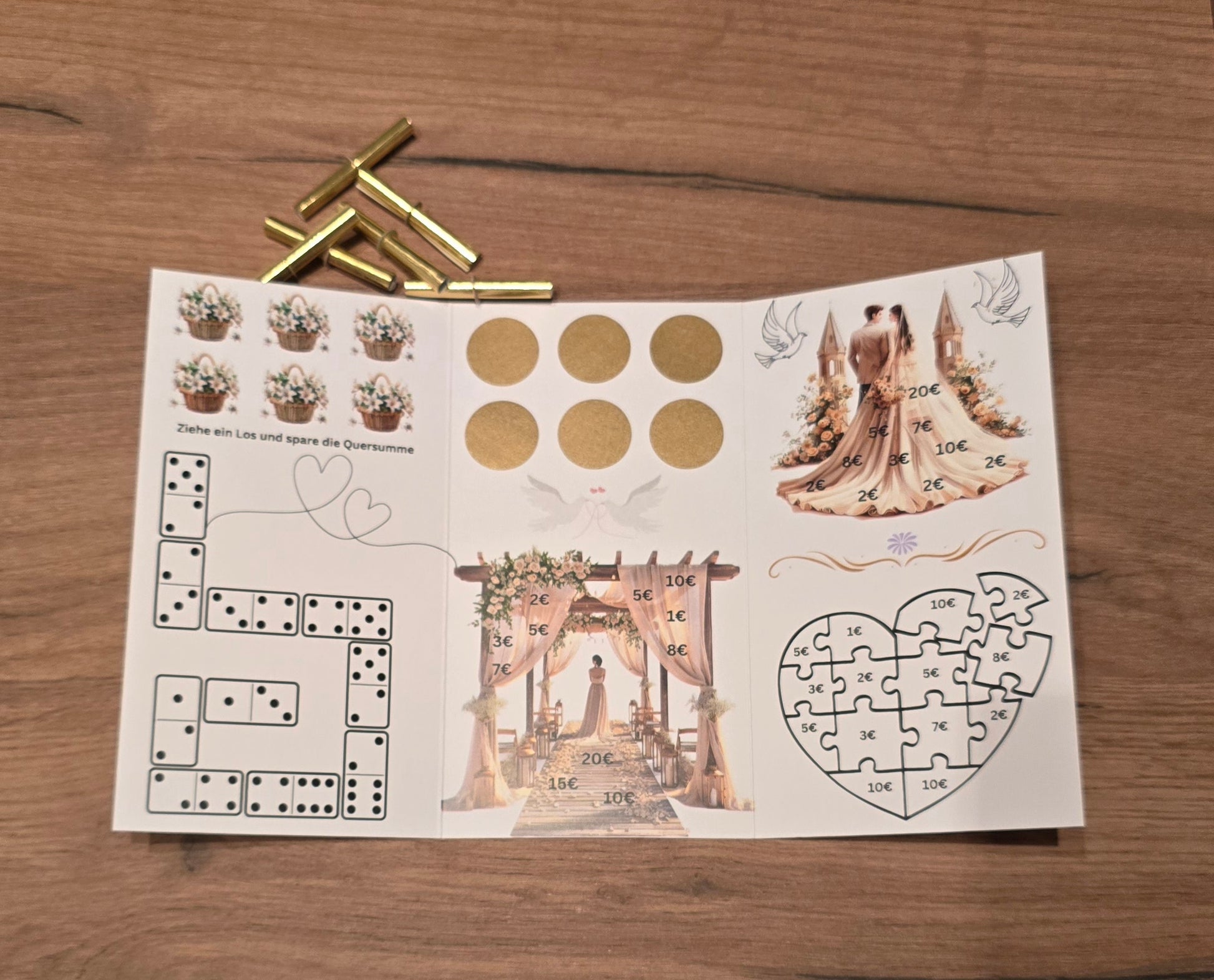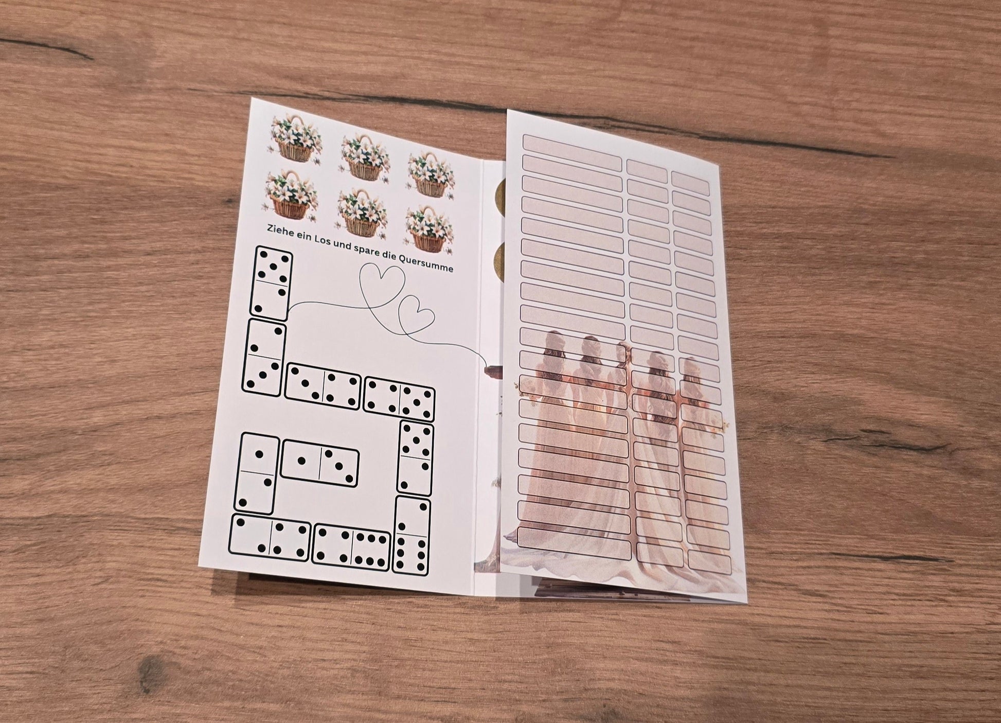 Spare mit der 3-seitigen Klappkarte in dem du die Beträge abhackst, würfelst, Lose ziehst und die Felder frei rubbelst.