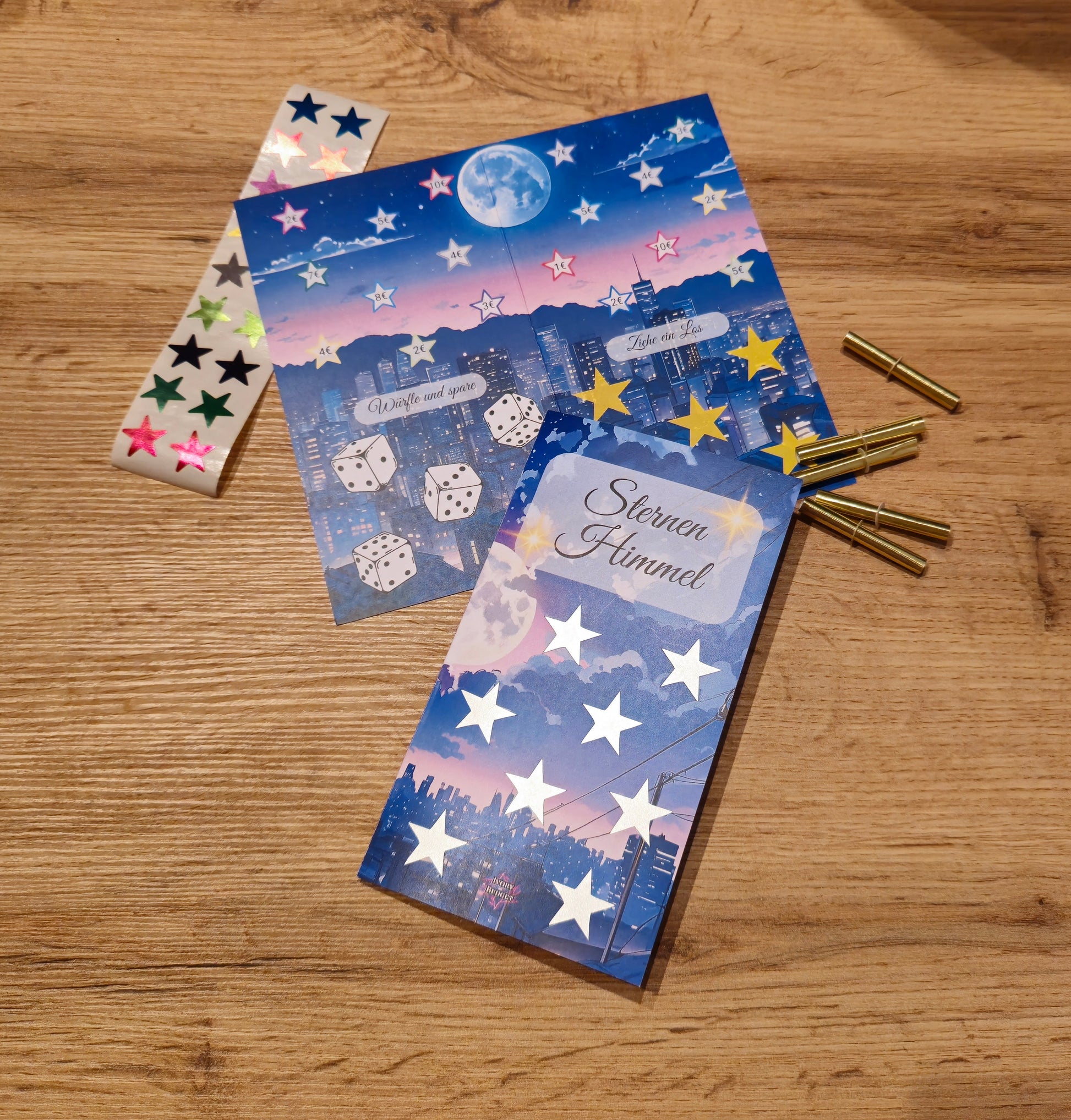 Spare die Beträge der Sterne und klebe den farbig passenden Stern in die Klappkarte, rubble die Sterne vorne auf und spare die Beträge, würfle und ziehe ein Los.