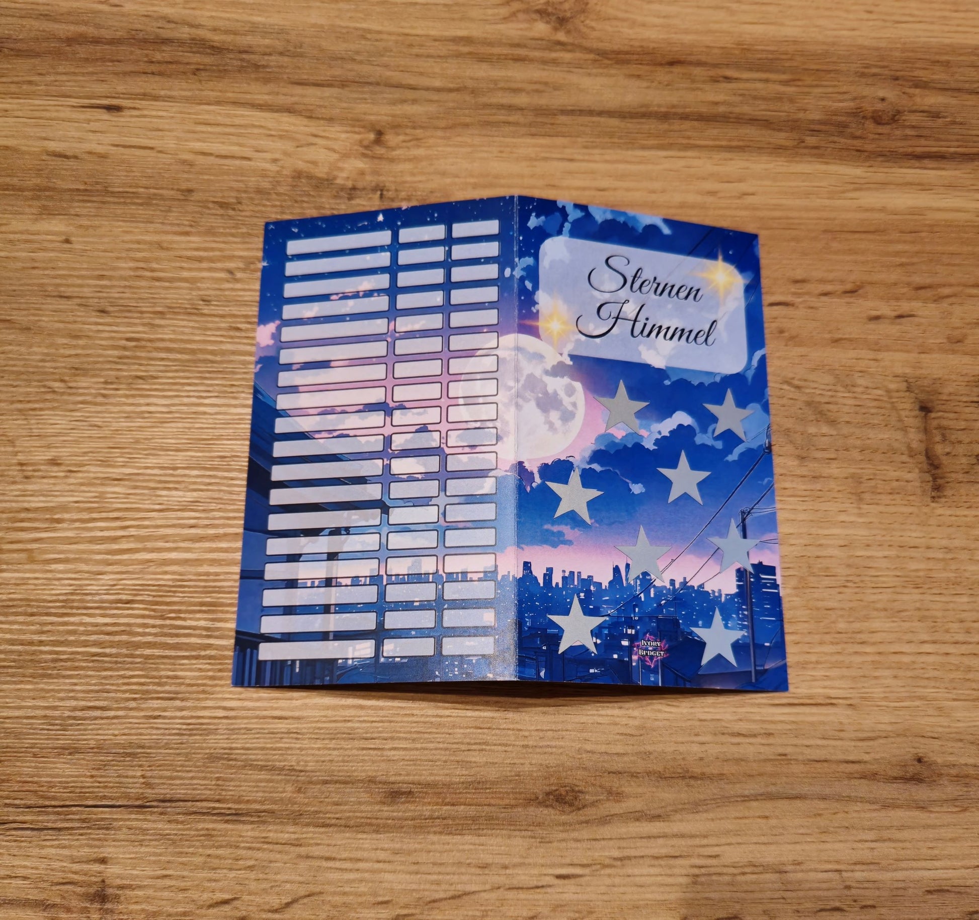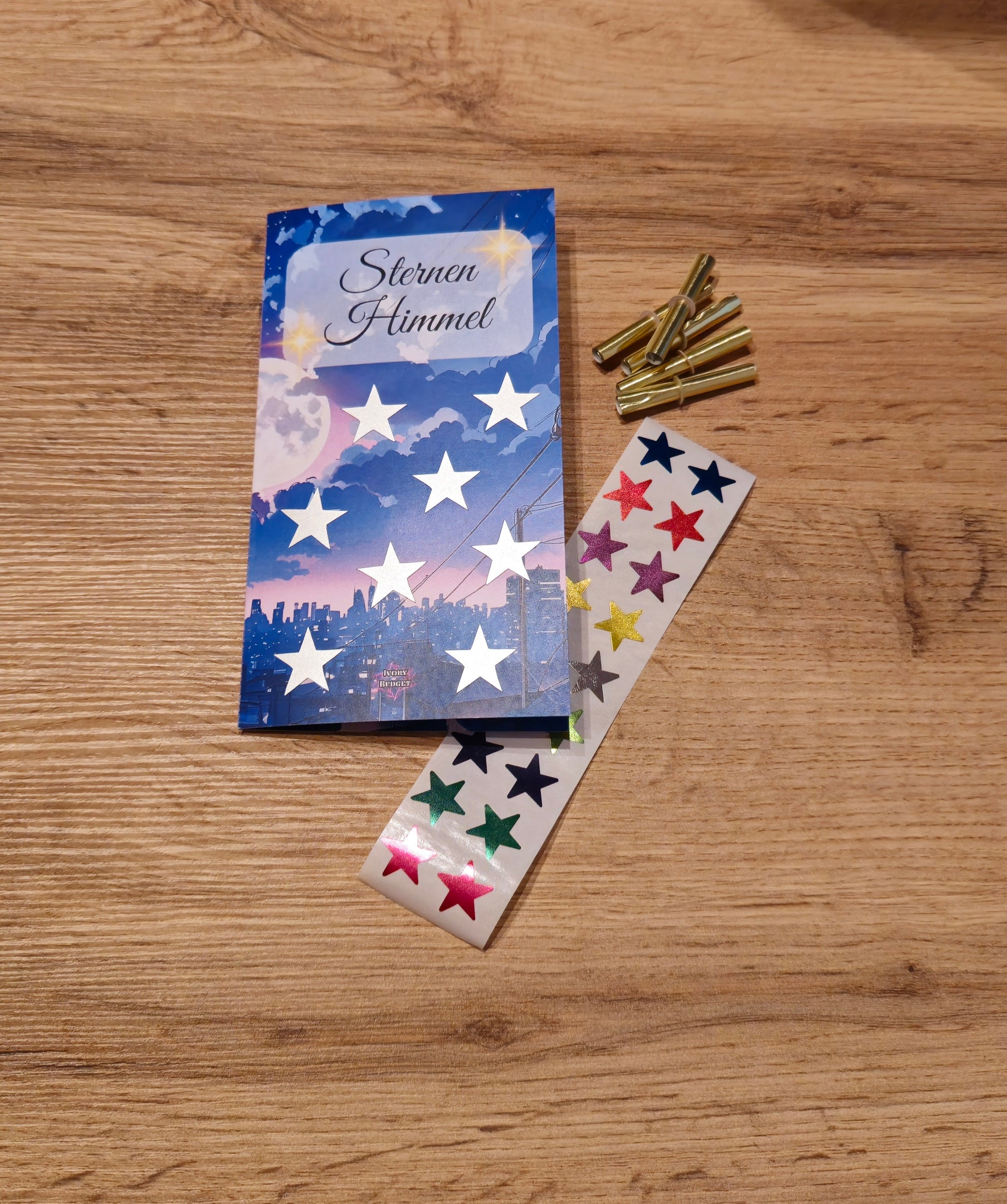 Erhalte eine 2-seitige Klappkarte mit 5 Losen und 18 Sternen Sticker.