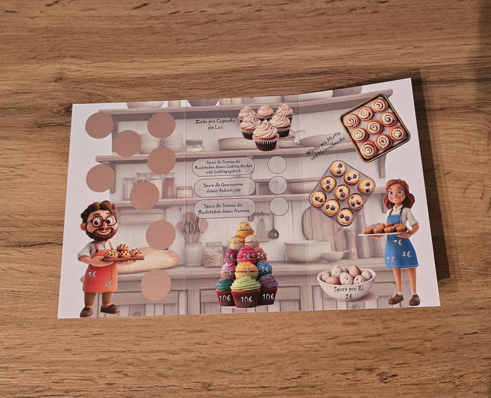 Spare mit der 3-seitigen Klappkarte in dem du die Beträge abhackst, würfelst, die Felder frei rubbelst und Lose ziehst.