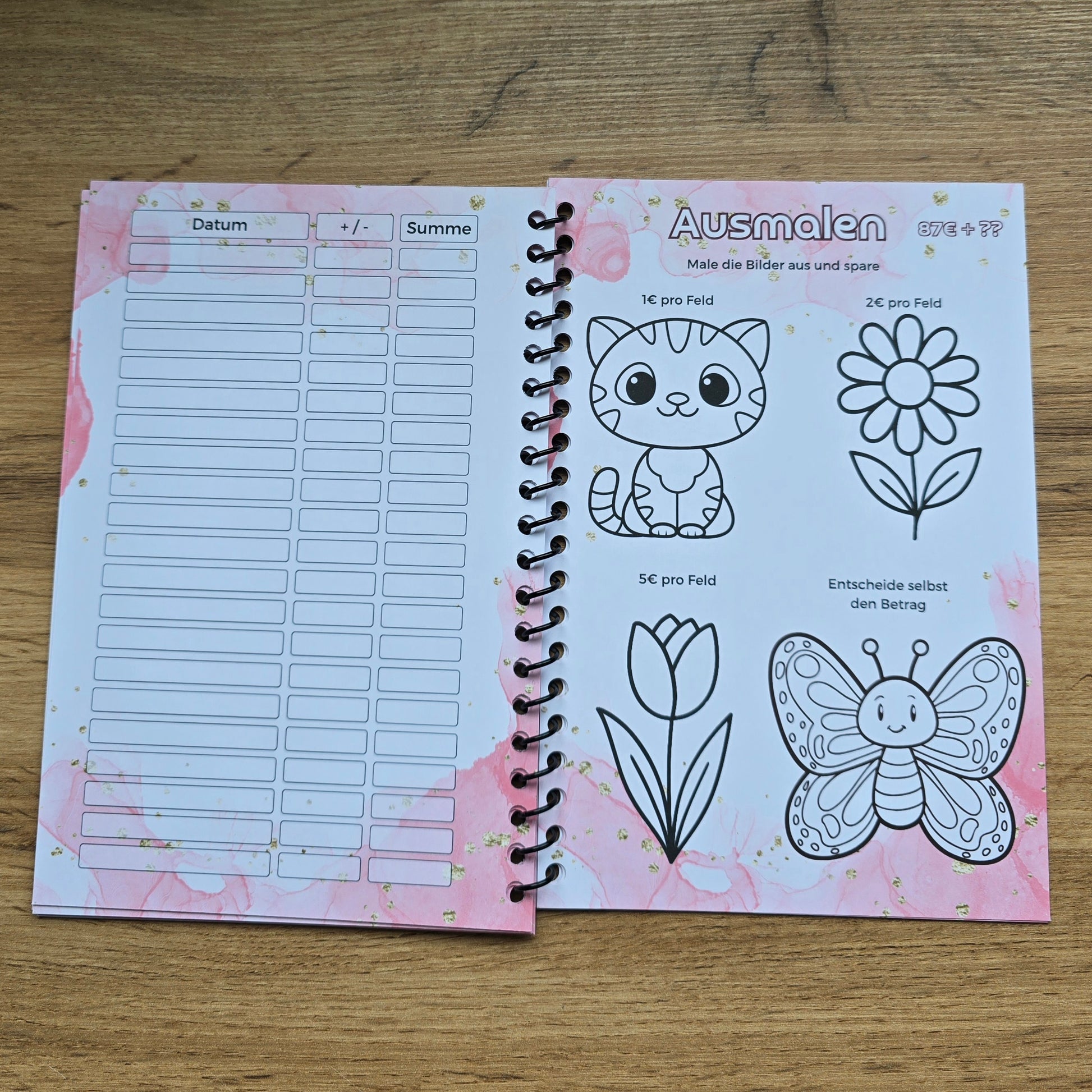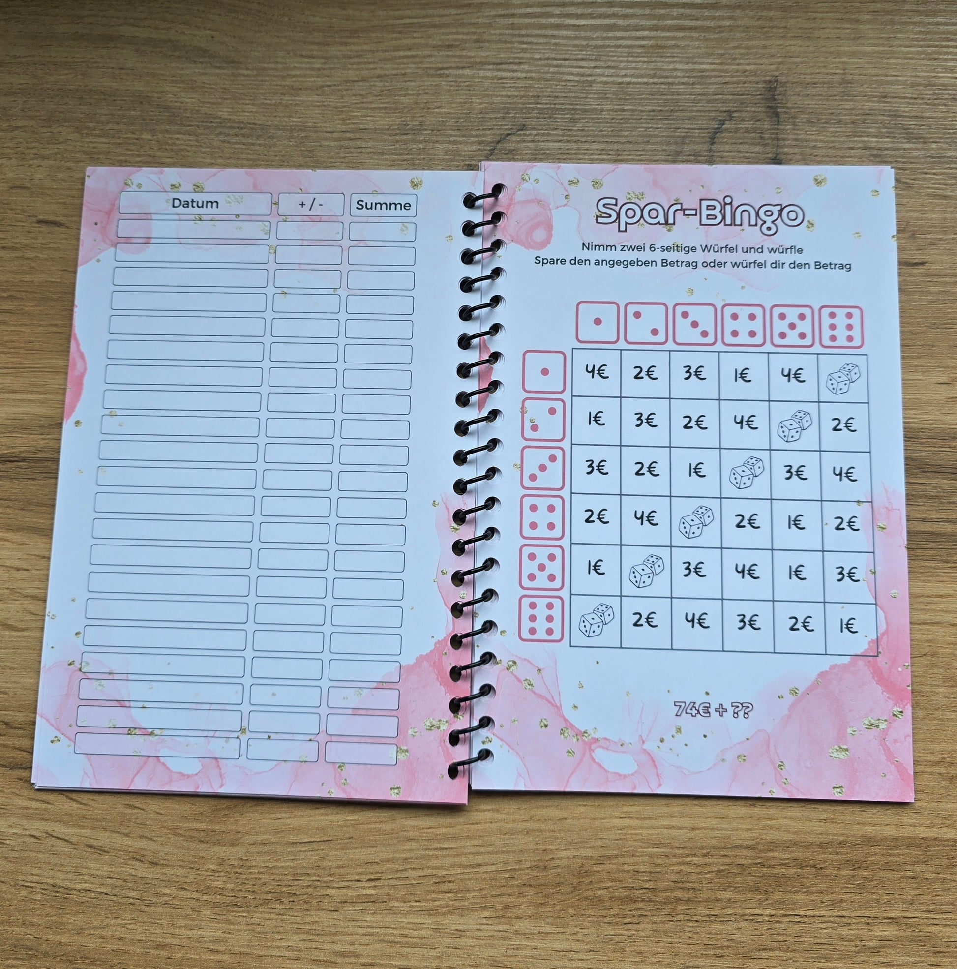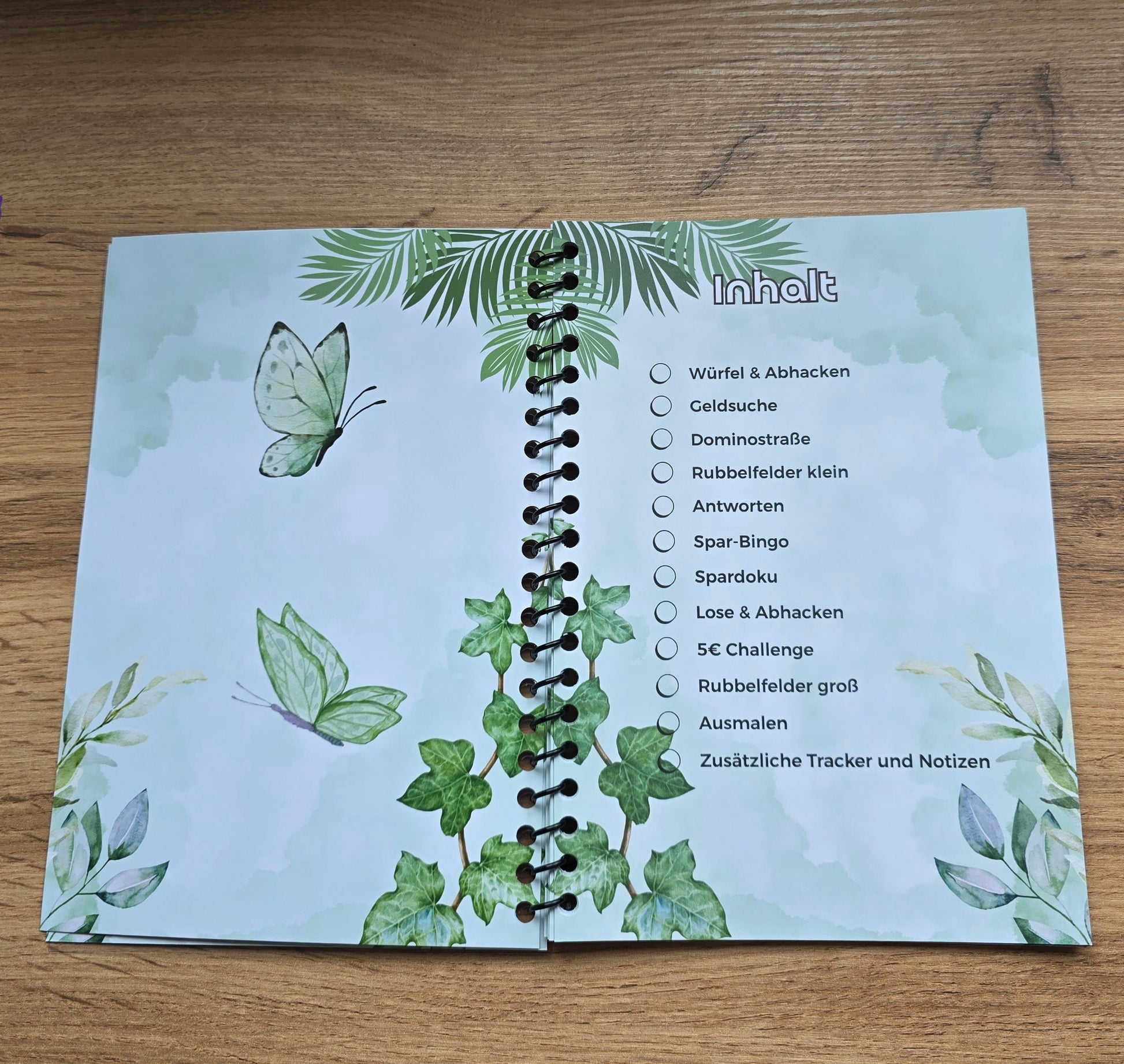 Es gibt einiges zu machen, Rubbeln, Würfeln, Lose ziehen, Ausmalen, Spardoku, Spar-Bingo, Abhacken, Geldsuche, Dominostraße, Antworten, 5€ Challenge und hinten sind zusätzliche Tracker und auch Platz für Notizen.