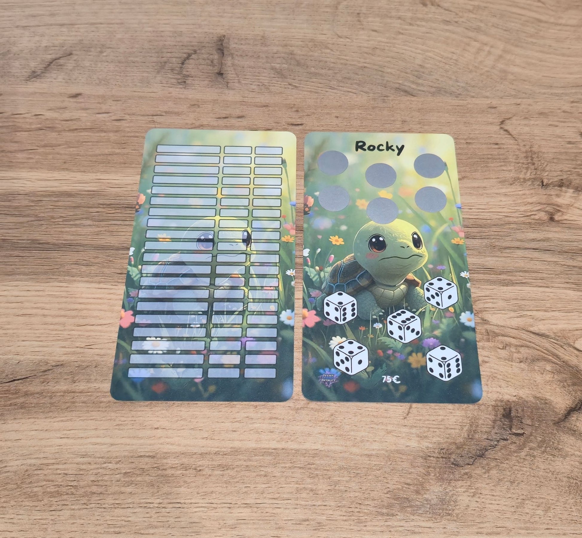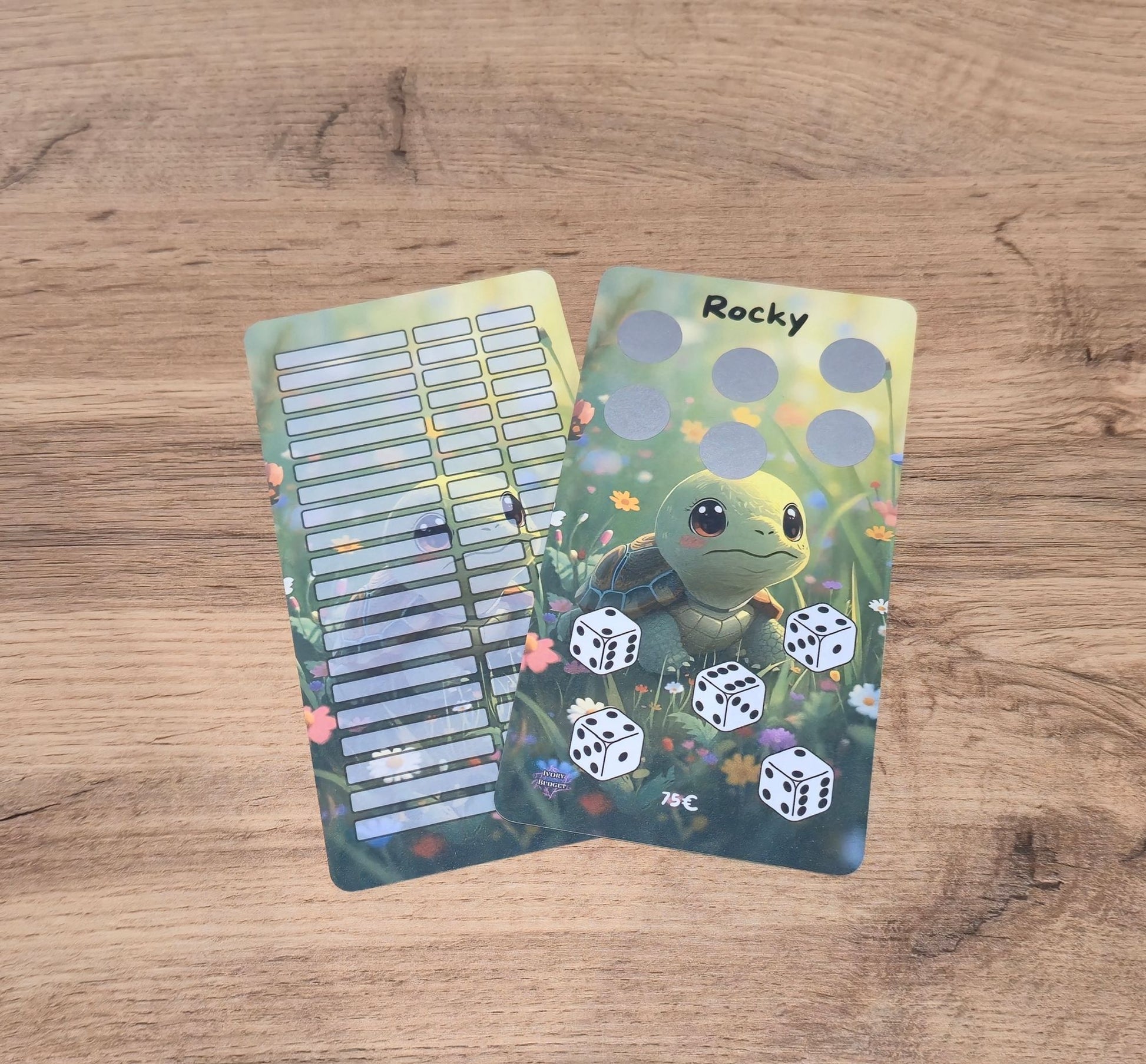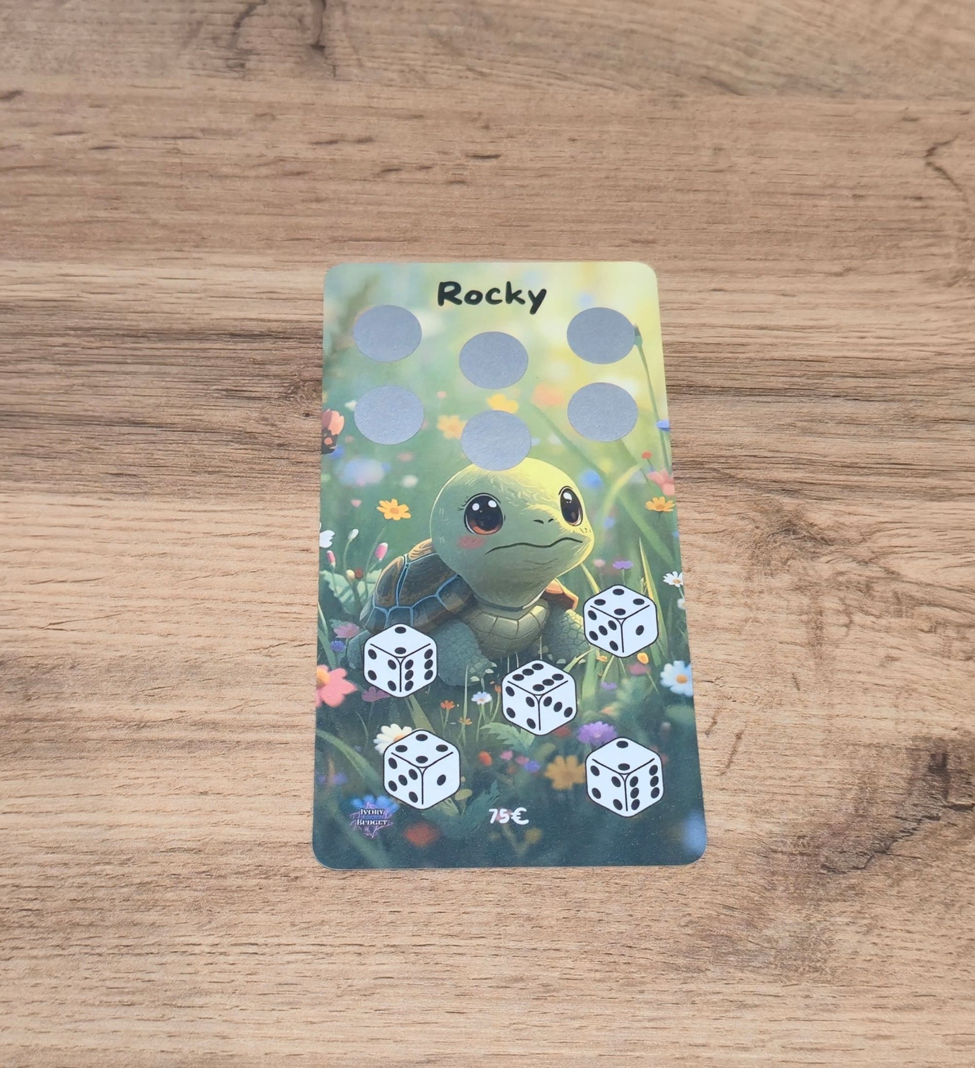 Spare mit der Schildkröte Rocky in dem du Felder freirubbelst und würfelst.